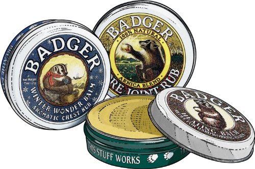 The Organic Badger Balm Survival Kit, sold at Duluth Trading Co., naturally heals chapped skin, soothes aches and clears stuffy noses. Winter Wonder Balm is a soothing, natural decongestant with extra virgin olive oil, castor oil, beeswax, essential eucalyptus oils, peppermint, lavender and extracts of ginger and rosemary. Rub a little on your rattling chest, or mix ½ teaspoon into a humidifier or pot of hot water and inhale. You'll be breathing easier in no time! Sore Joint Rub relieves tired joints and tender muscles, thanks to arnica and circulation-enhancing black pepper. Rub it in and rub out pain. Healing Balm is Badger Balm's exclusive treatment for rough, cracked and chapped hands. Ingredients include extra virgin olive oil, castor oil, beeswax, aloe vera extract and essential oils of wintergreen and sweet birch. Your hands will thank you! USDA-certified organicMade of all-natural ingredients, including extra virgin olive oil, beeswax, essential oils and herb extractsSoothe hardworking hands, relieve a cold and calm tired joints and musclesWinter Survival Kit contains three ointmentsEach tin is .75 oz.Made in New Hampshire by a family-run business Read more...